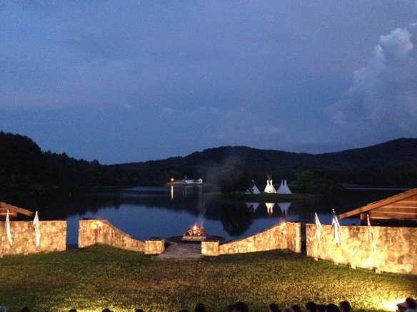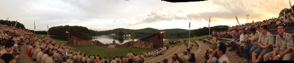 Wonderful opening campfire last night. Nearly 1,000 of our new closest friends joined us at the council ring. Opening skit is always impressive with lots of activity: hoopla-hoops, flame-throwing, bikes, frisbees, boats and skiers, and fireworks. Pretty cool way to kickoff the week.