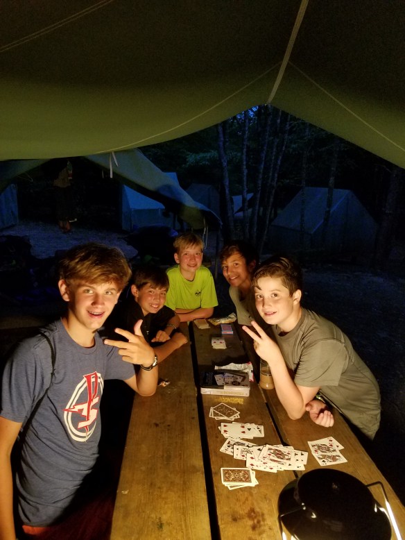 We are rocking and rolling as the scouts are knocking out their merit badge requirements and dominating free time with rifle shooting, swimming and hatchet/knife throwing, archery, playing cards and buying junk food at the trading post. Other highlights: we broke out into patrols at each grade level and elected leaders, some of our scouts attended a flag retirement ceremony with 21 shotgun salute. Some cool wildlife has been spotted such as deer, racoon, and bats. We picked up the church bus from the repair shop and it’s ready for our trip back to Birmingham. For the record each scout has showered at least once. Two more days to go!