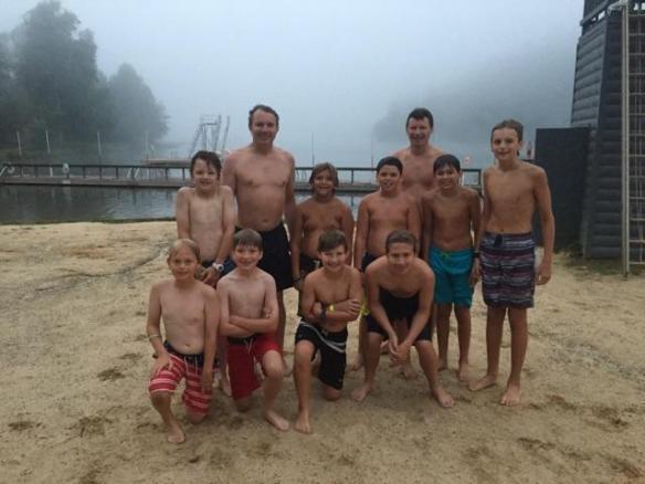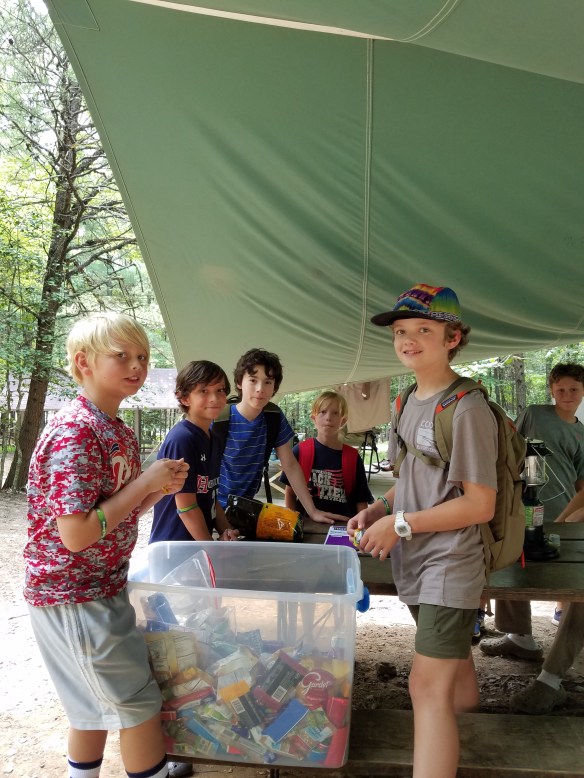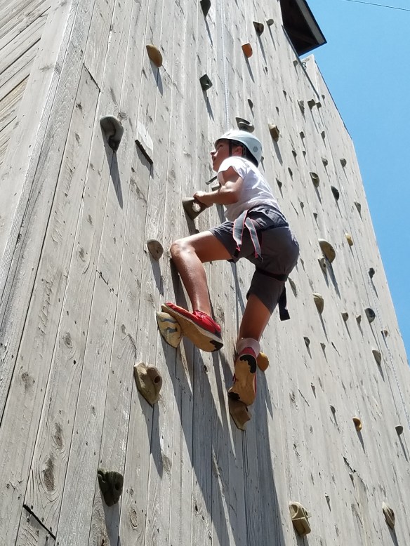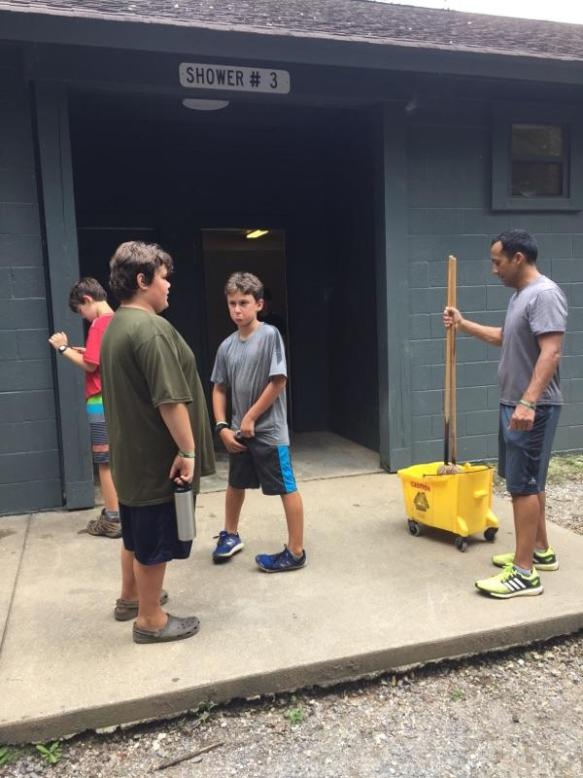 Day 5 was a busy one that started with a 5:30am polar bear plunge, we had a few brave scouts who participated. After morning classes and a delicious chicken sandwich lunch we ventured to the climbing tower for bouldering, climbing and rappelling. Then it was our troop’s turn to clean the bathhouse, I was amazed by some of the cleaning skills. Then we wrapped up the day with free time, dinner and a campfire. One more day to go!