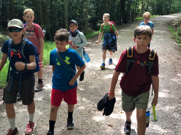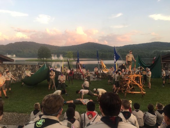 Today we awoke to reveille at 0700 followed by breakfast of French toast, sausage patties, and cold cereal. Then we were all off and running (not really; no running in camp) in different directions where we worked on merit badges such as Citizenship in the Nation and the World, Communications, Riflery, Emergency Preparedness (or E-Prep as the cool kids say), Chess, Swimming, Shotgun Shooting, Environmental Science, and the list goes on and on. The newest scouts spent a good chunk of the morning at the Mountaineer program where they started working on the Totin’ Chip where they learn the safe use of woods tools (blades of all shapes and sizes!) and worked on the bowline and sheet bend knots.