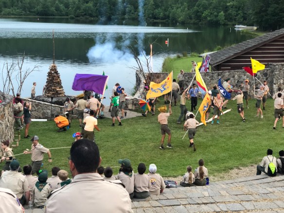 We arrived safely at Woodruff and quickly got through check in. After a Troop photo we got briefly situated at our campsite before it was time to get our swim tests done. We quickly changed back into our Class A uniforms in order to meet on the parade ground for the retrieval of the colors and then a delicious camp meal of chicken fingers, mac n cheese, corn, and a salad bar. Yum! We finished the night with an always fun and entertaining campfire program put on by the staff.