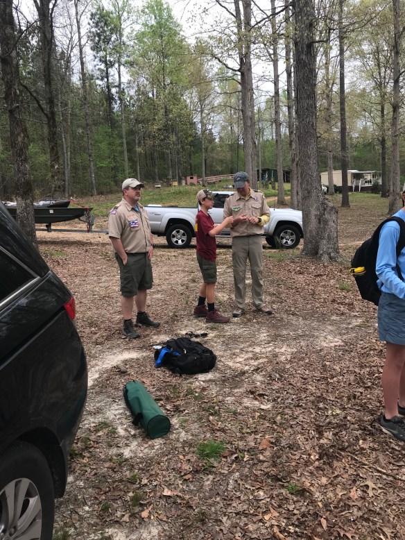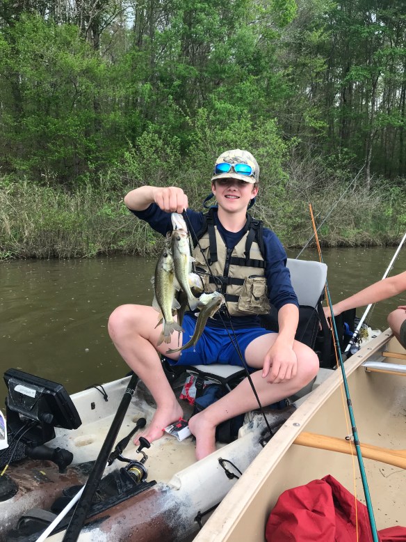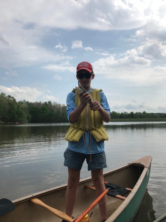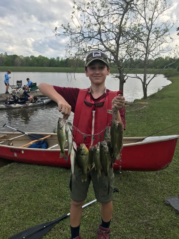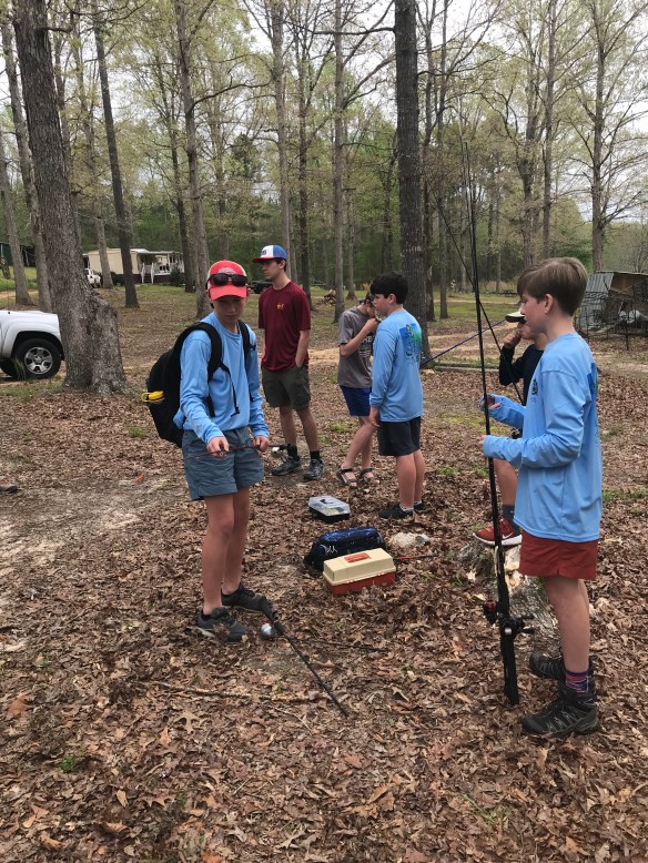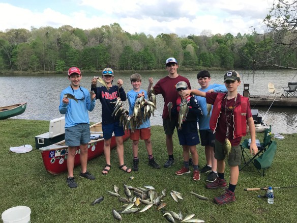 The troop had a great day fishing at a private lake in Heflin, AL. Mr. Garner was instrumental in locating a place for us to still fish, after the Hiwassee trip had to be cancelled due to the TVA running the turbines this weekend. We were told there would be plentiful Bass, Bluegill and Crappie, and we were not disappointed. Everyone caught a fish, with many catching more than 10! They were hitting worms, Sinko lures, and anything green! Here’s to some good eating tonight!