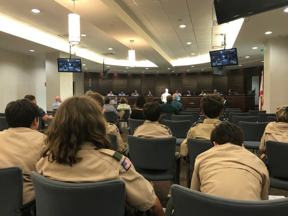 The troop attended the Homewood city council meeting to complete a requirement for Citizenship in the Community merit badge. The troop heard several interesting discussions of sign variances, excessive growth properties and Brookwood Live approval.